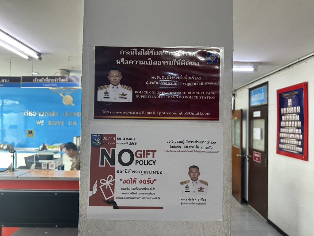 สภ.บางบ่อ ได้ดำเนินการติดตั้งป้าย No Gift Policy ในจุดที่ประชาชนมองเห็น ณ จุด One Stop Service อีกทั้งประกาศในช่องเว็บไซของหน่วย เพื่อให้ทราบเจตนารมย์ในการไม่รับของขวัญและของกำนัลทุกชนิดจากการปฏิบัติหน้าที่