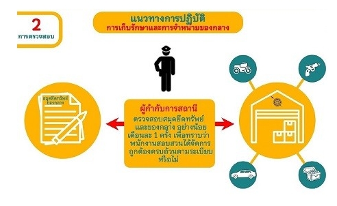 2. กำหนดแนวทางควบคุม กำกับดูแลรักษา ตรวจนับ ตรวจสอบสภาพการใช้งานทรัพย์สินของราชการ ของบริจาคโดยเฉพาะทรัพย์ประเภทที่มีความเสี่ยงในการนำไปใช้โดยมิชอบ